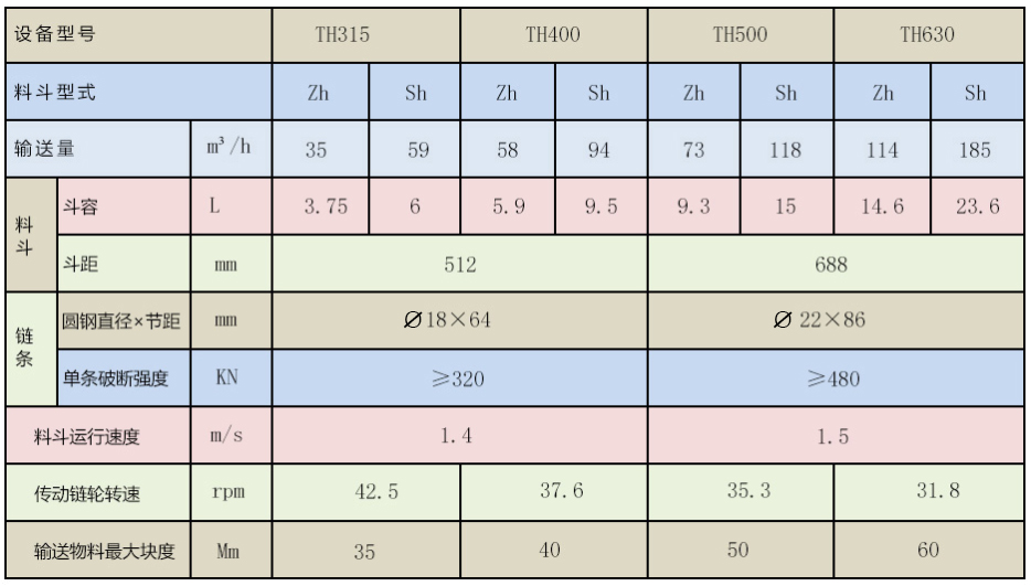 TH系列斗式提升機(jī)主要技術(shù)參數(shù)表